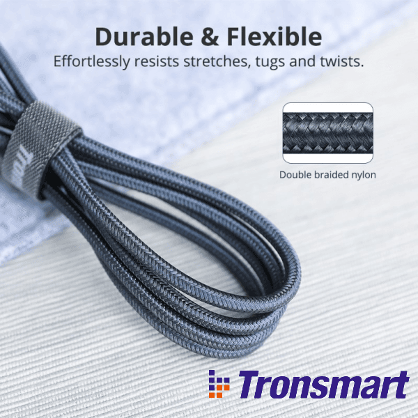 El cable tipo C a Tipo C trenzado de nylon de Tronsmart tiene un diseño trenzado de tela de primera calidad que no solo se ve elegante, sino que lo hace libre de enredos, mientras ofrece una carga rápida y transferencia de datos a alta velocidad. Ha sido diseñado para soportar el uso rudo, caídas, fluctuaciones de voltaje y temperaturas extremas para que nunca tenga que preocuparse por la durabilidad o el rendimiento. Simplemente conéctelo y manténgase conectado. Nunca más tendrá que preocuparse por un cable enredado ya que el diseño trenzado premium de este cable tipo C no solo se ve atractivo, sino que también garantiza que el cable permanezca desenredado y listo para usar, siempre.